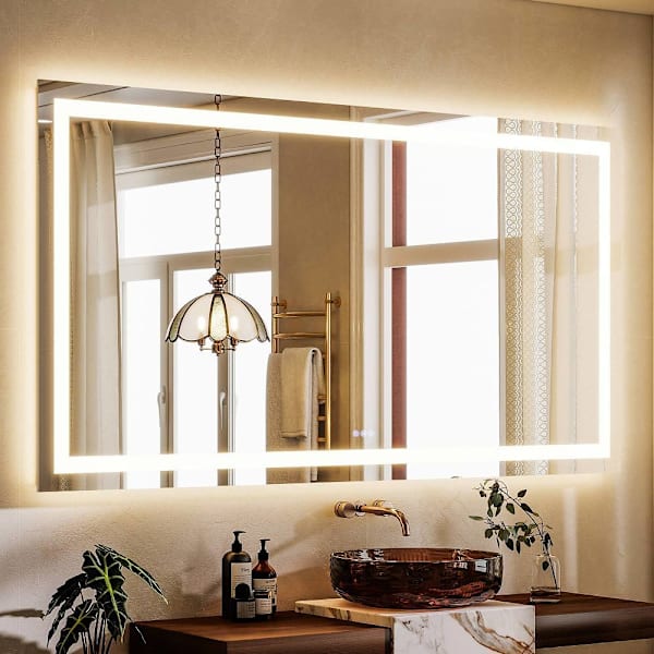 This LED wall mirror features three adjustable light tones—along with responsive touch controls and a built-in defog function for a clear view in humid conditions. It supports hardwire or plug-in installation. The seamless frameless design saves your preferred settings for effortless daily use.